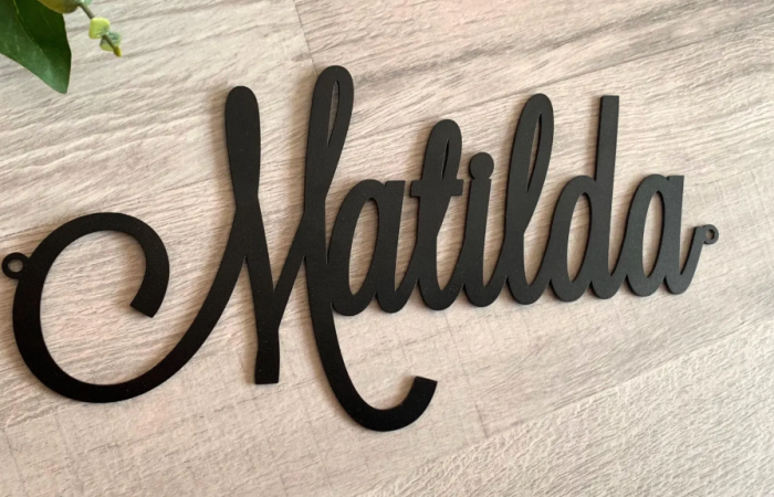 Decorațiune metalică personalizată cu nume, tăiată laser, realizată la comandă. Design modern, durabil, perfect pentru casă, firmă sau cadou special.