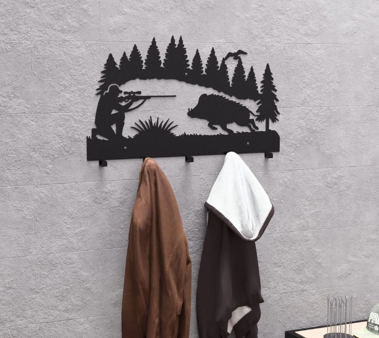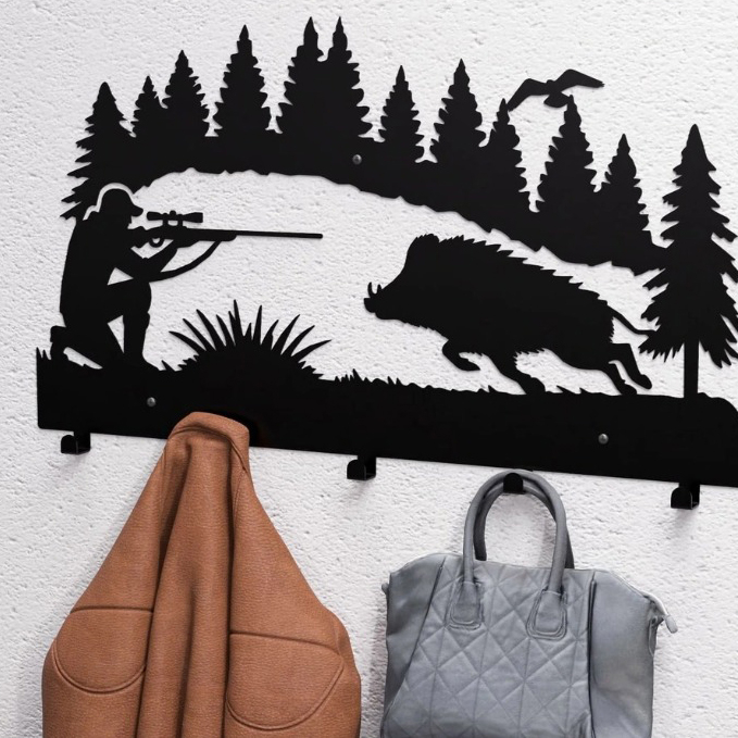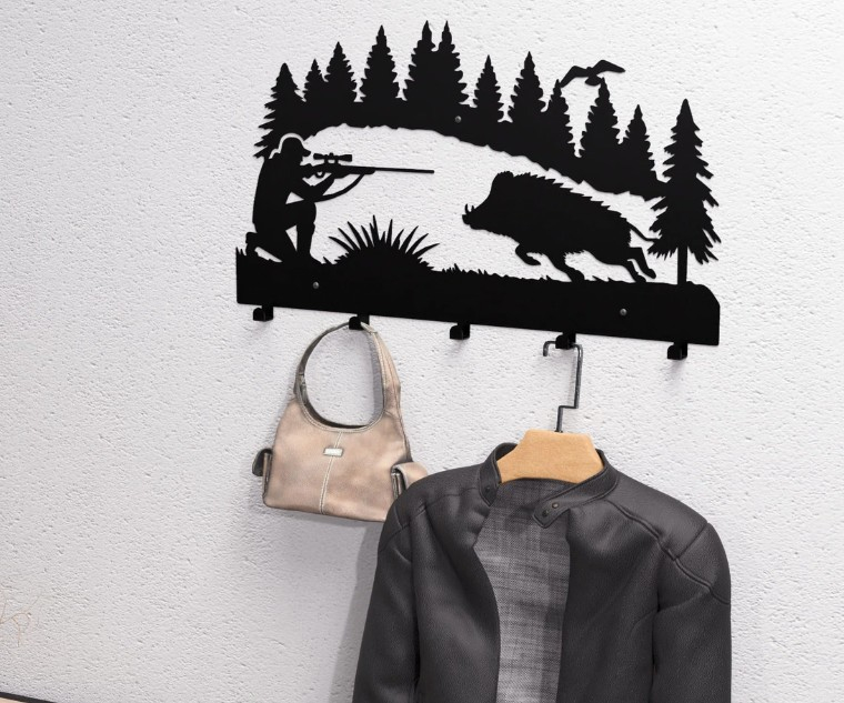 Combinați pasiunea pentru vânătoare cu utilitatea zilnică! Acest cuier metalic robust este piesa perfectă pentru hol, birou sau, mai ales, pentru cabana de vânătoare. Designul său unic, o siluetă dinamică cu un vânător țintind un mistreț pe fundalul unei păduri, adaugă caracter oricărui spațiu.