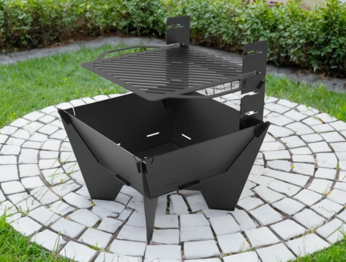 Vatră de foc cu grătar pătrată 600 – semineu exterior puternic și practic pentru curte, grădină sau terasă, perfect pentru seri relaxante în aer liber.
